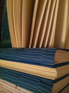 Students produce blank books in the the Longstitch, an exposed sewing style. This book was popular in medieval Europe forward, especially with a stronger need for blank ledger books, which was part of their popularity. The sewing is visible on the spine of the book. The Longstitch binding makes for versatile and hardy sketchbooks or journals or notebooks. The book opens flat or folds back on itself without damaging the spine, which has a decorative thread pattern on it, thus the term “exposed sewing”. We will learn another sewing method for the instructor’s “Uncased Binding” blank book (traditional case binding with paper case).