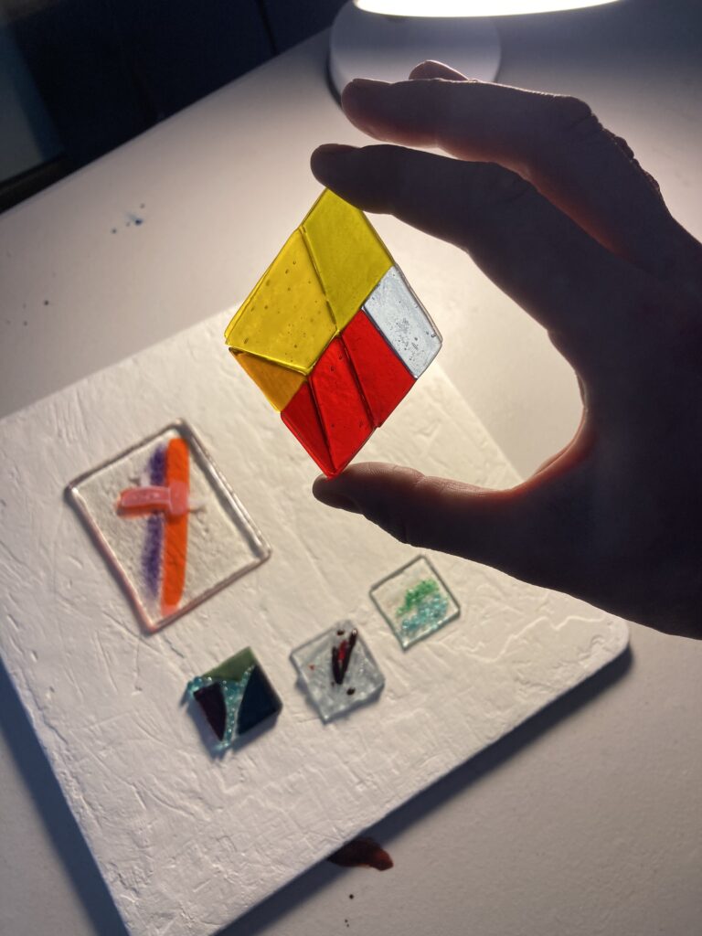The objective of this class is to give students with little or no prior knowledge of fused glass the basic information and techniques of the craft, so that they can leave with several pieces of glass art that they are happy with, but also with a good understanding of what does and doesn’t work in the studio, and what is safe or unsafe.