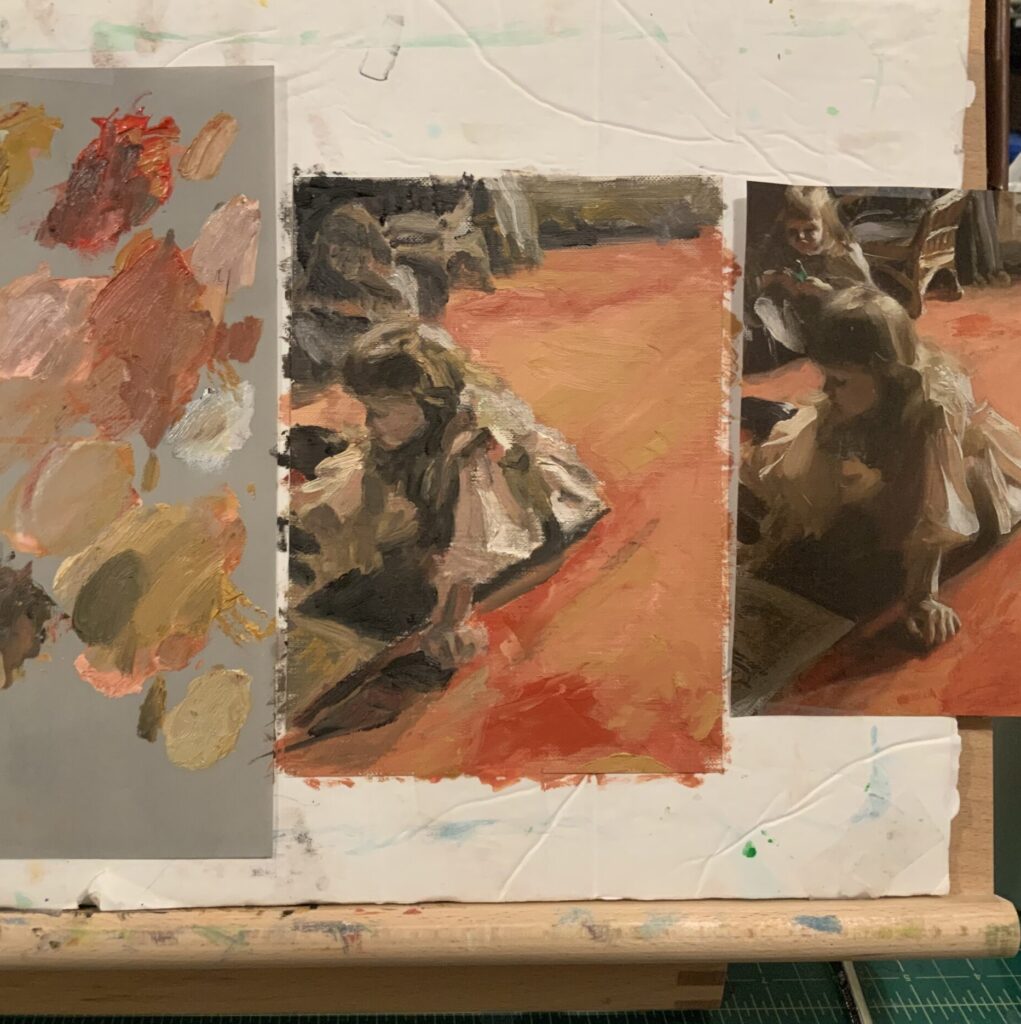 Charles Bargue and Jean Leon Gerome developed a set of sequenced lithographs in the early 19th century to teach by doing. The lithographs reveal insights into methodical drawing steps, all done through observation. With guidance, a student gains high-level skills that later inform her art, no matter if it’s realistic or abstract. The “Zorn Palette” explores color combinations using a limited number of basic colors used in combination to form a robust palette of possible colors that create rich works of art.