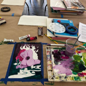 An apron, paper, writing instruments & materials will be provided. It is recommended you wear clothing you wouldn’t mind getting paint on. If you would like, you are welcome to bring a journal and any personal materials you may want to use for mixed media & collage.